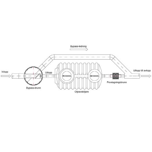 • Bypassbrunnar installeras när stora lågriskytor avvattnas till oljeavskiljare. Med bypass säkerställs rening och säkerhet på oljeavskiljaren. Den minimerar storlek och den totala kostnaden på hela avskiljarsystemet